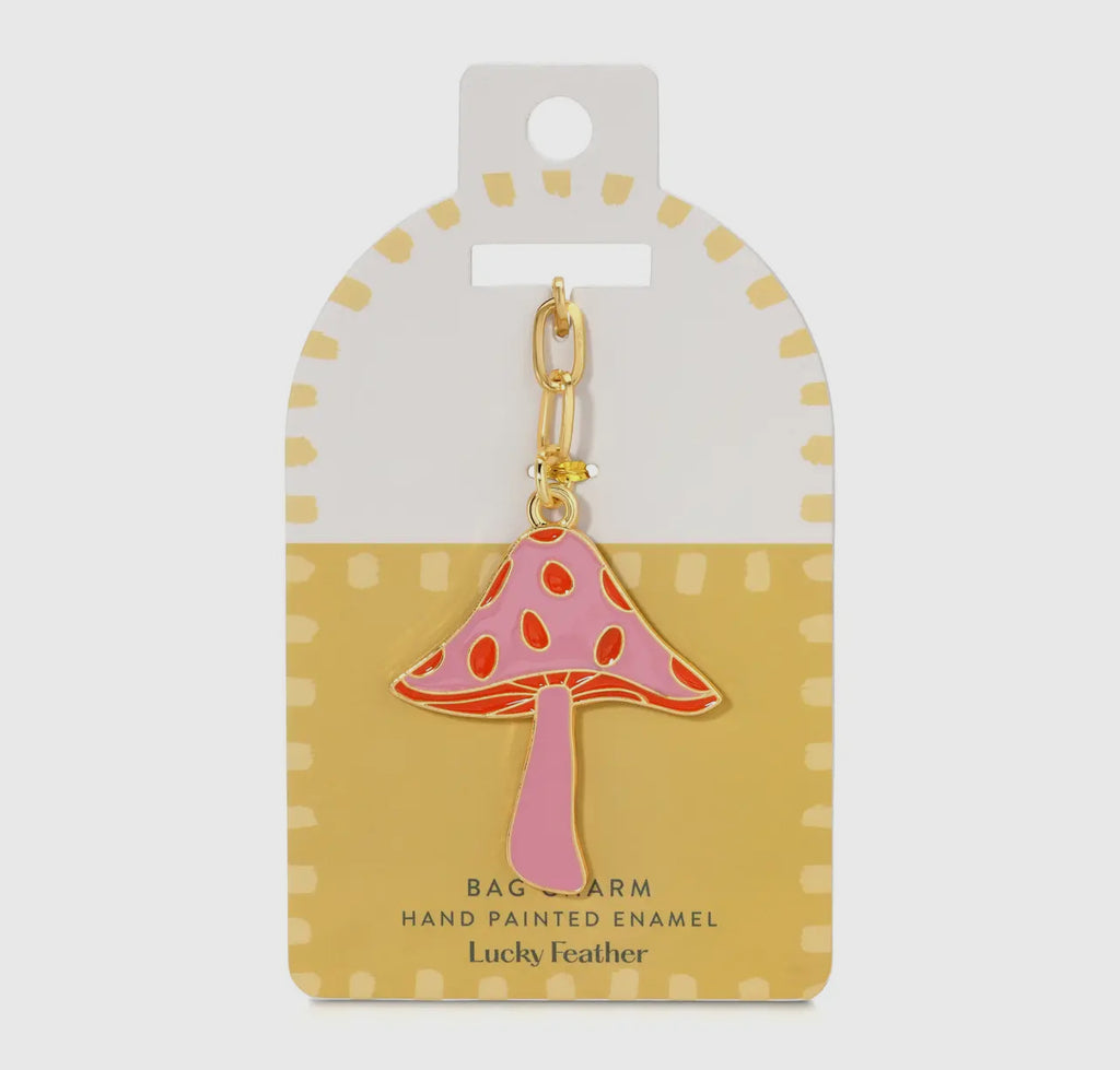 A whimsical touch for any tote! This hand-painted enamel charm features a magical mushroom in cheery pinks and reds. Finished with gold-plated hardware and a lobster clasp, it's easy to clip onto bags or keyrings. Packaged on a sunshine yellow card for maximum shelf appeal.