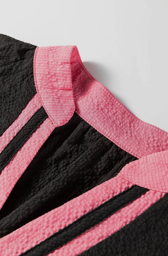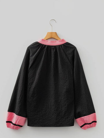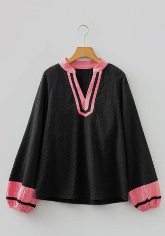Colorblock Patchwork V-Neck Textured Blouse, Black