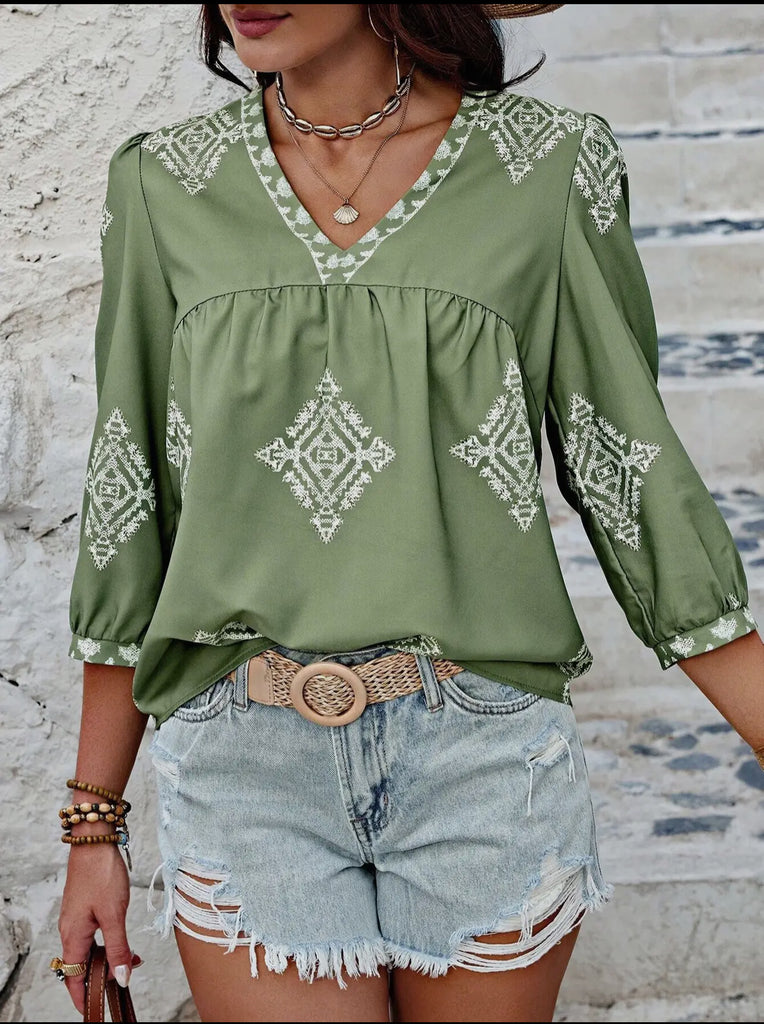 Fashion Printed U-Neck Women’s Short Sleeved Top, Green