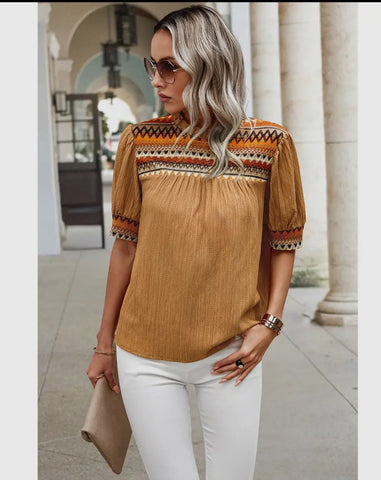 Geometric Print Elegantly Textured Short Puff Sleeve Shirt, Mustard