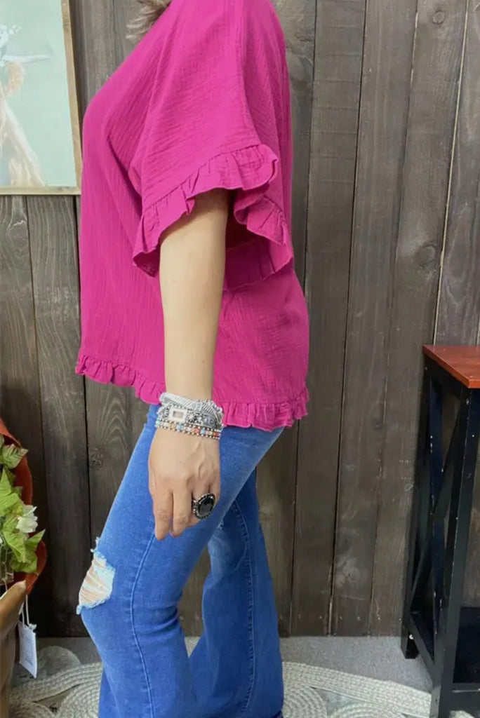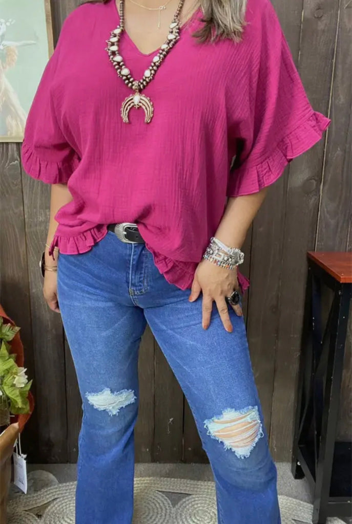 This adorable V-neck blouse is perfect for all occasions. It’s very comfy and has ruffle details on the sleeves and bottom hem for uniqueness. The vibrant color is perfect for Spring/Summer seasons.