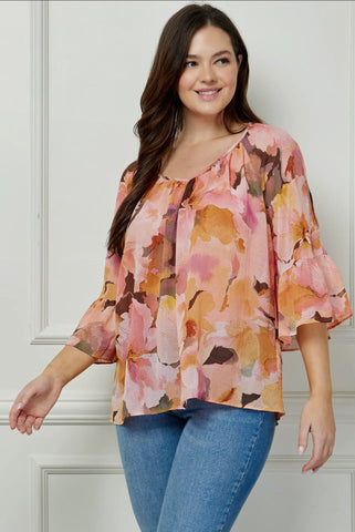 Raglan V-Neck Top With Double Ruffle Sleeve, Yellow/Peach/Brown, Plus Size