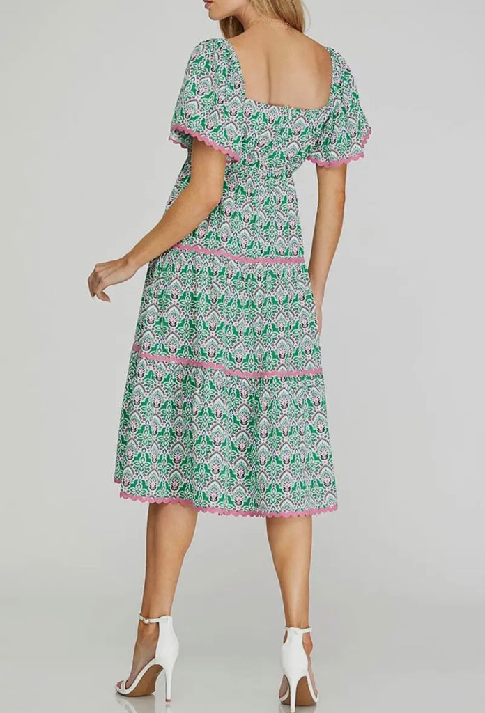 Green with pink trim Flounce Sleeves Tiered Ric Rac Trimming Midi Dress