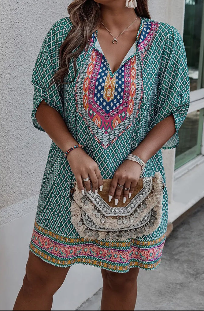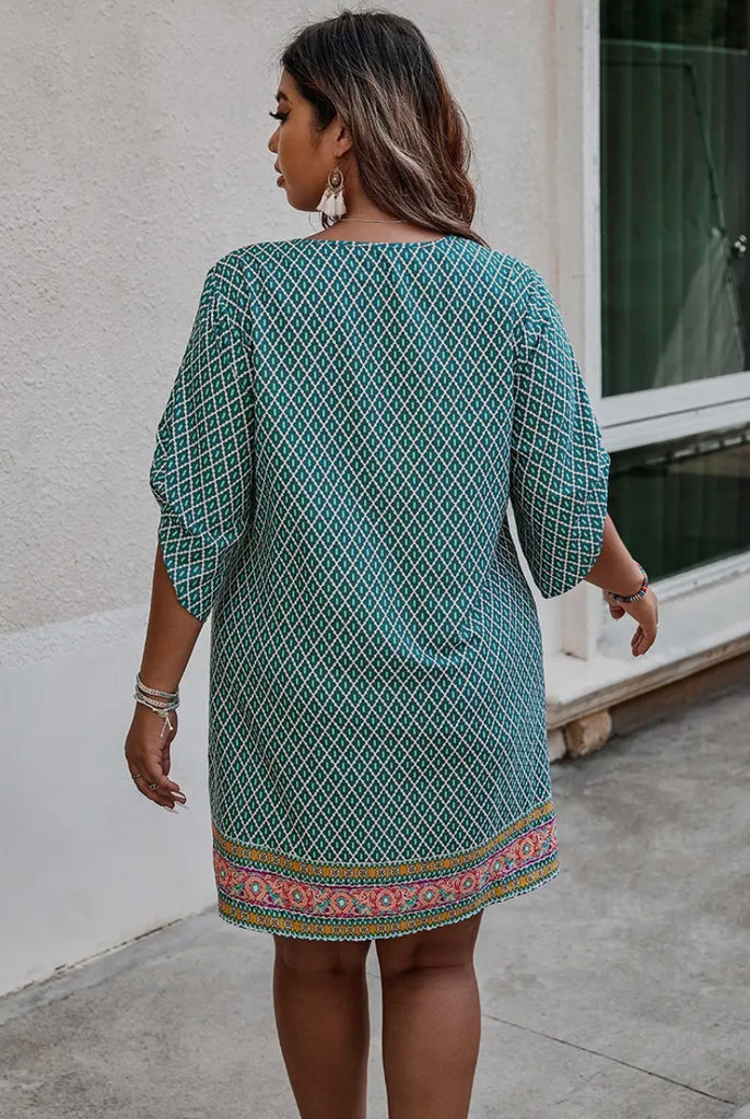 Dress - V Neck Printed Loose Fit MIDI Dress, Green, Plus Size