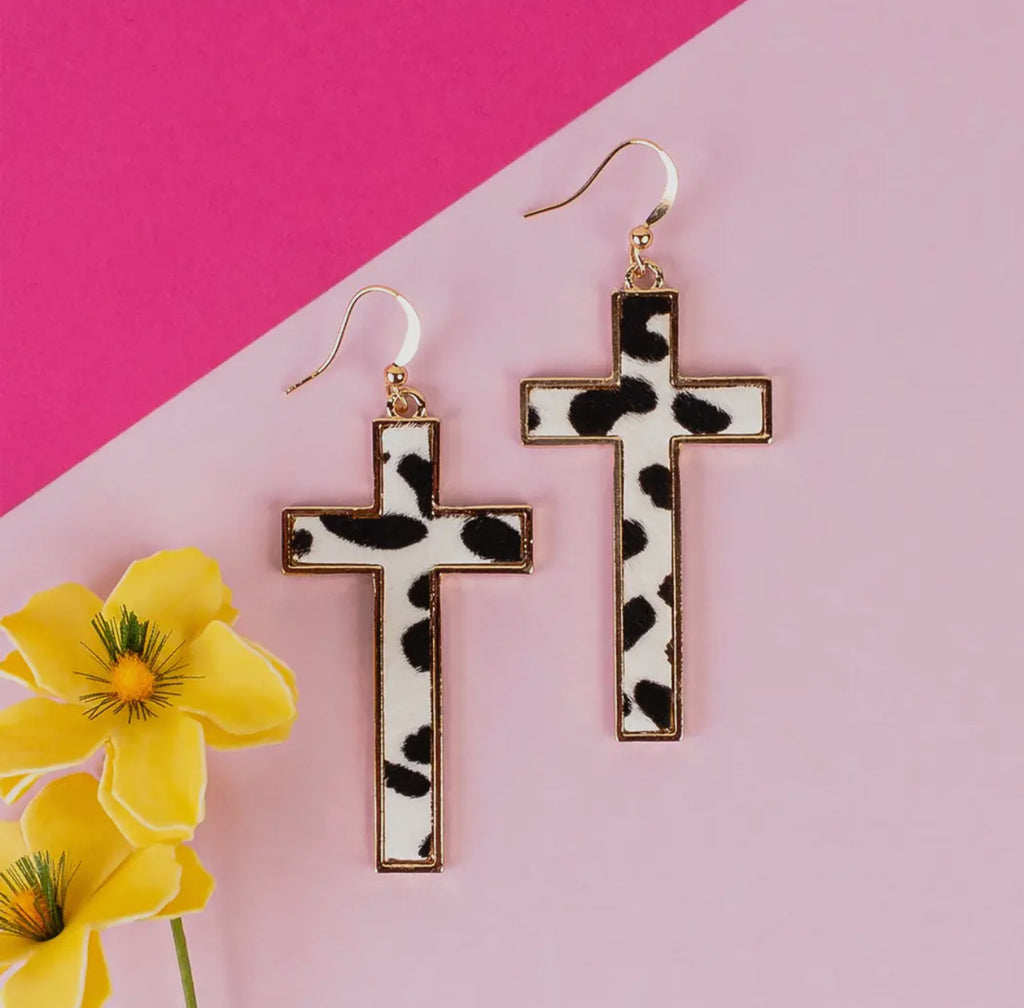 Animal Print Cross Earrings - Plain Faux Hide, Black & White