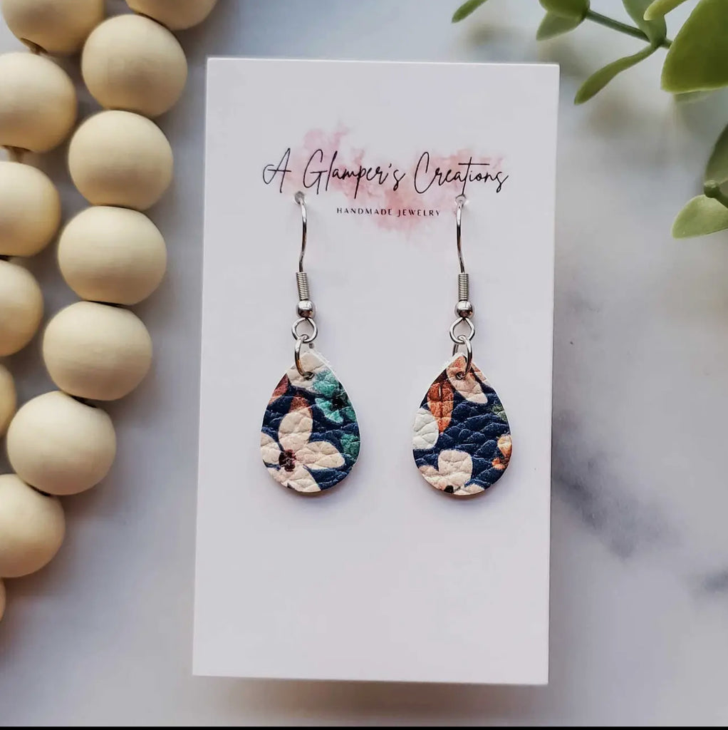 Navy Floral Mini Teardrop Leather Earrings
