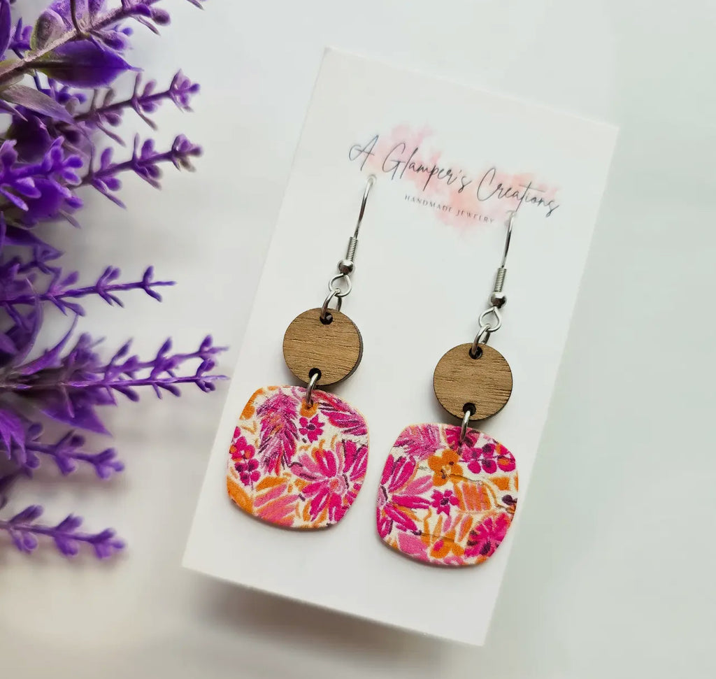 Pink & Orange Summer Floral Dangle Wood & Leather Earrings