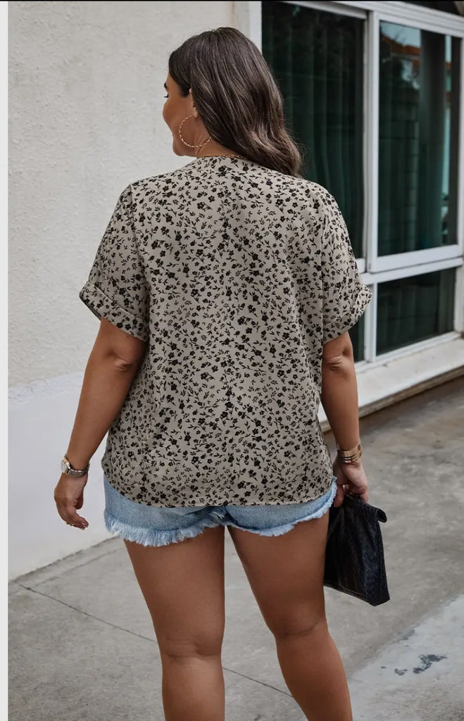 Floral Notched V Neck Short Casual Blouse, Khaki, Also Plus Size