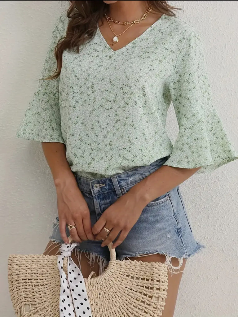 Blouse - V-Neck Floral Short Sleeved Top, Green, Also Plus Size