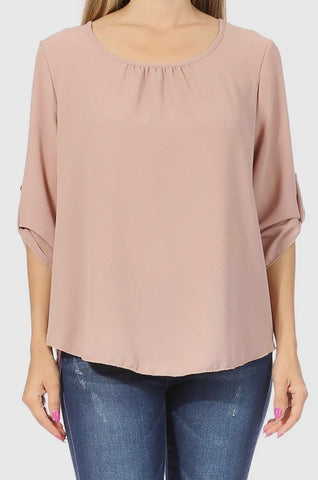 This casual round neck top is a versatile and comfortable piece suitable for various occasions and settings. It features roll-tab sleeves, making it adaptable to different weather conditions and personal style preferences.