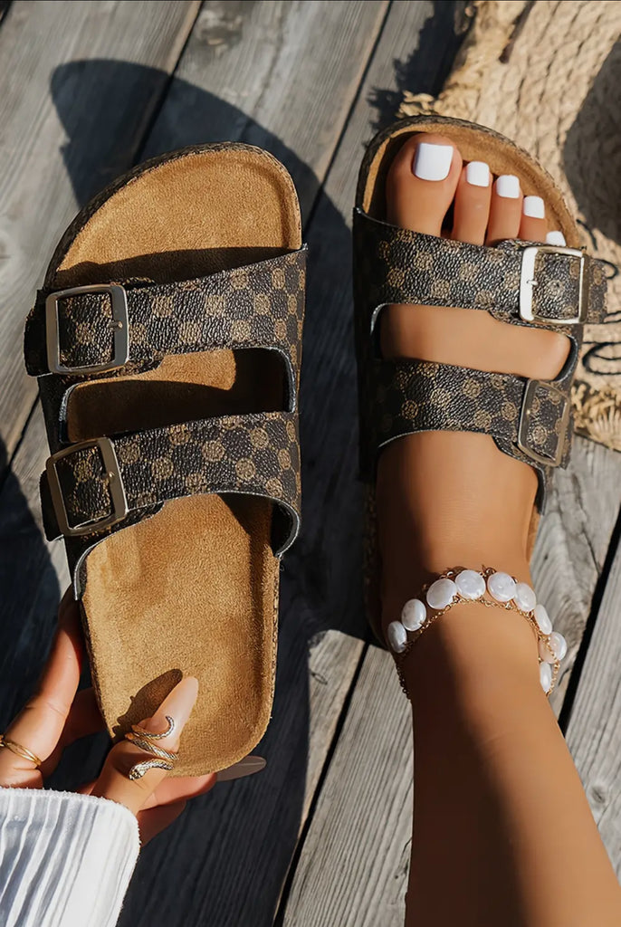 Ldc Geometric Print Cut Out Buckle Pu Leather Flat Sandles, Coffee