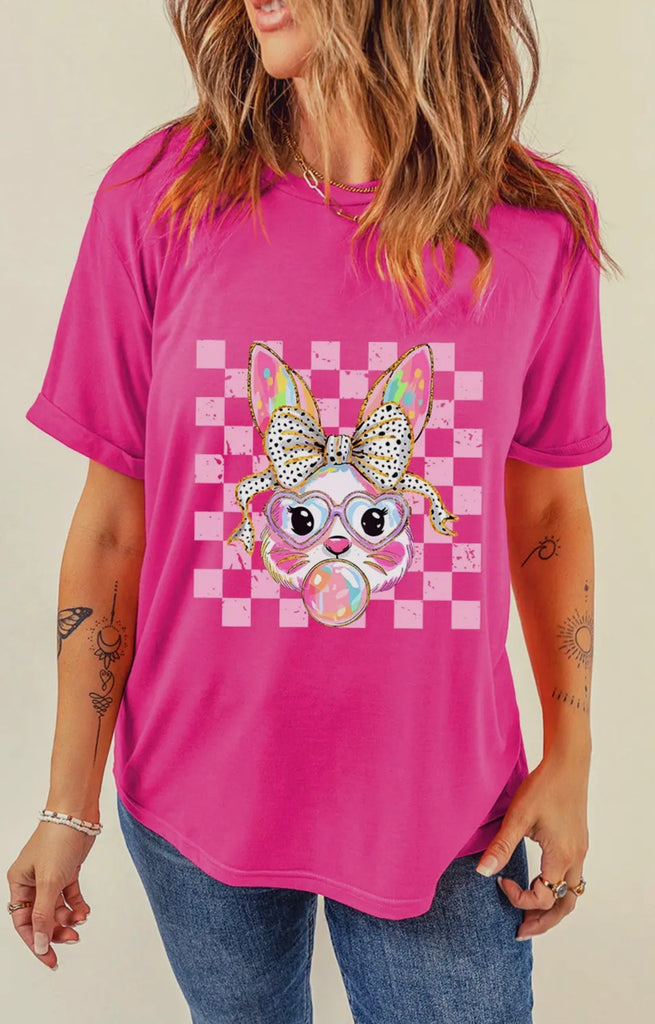 Pink Plaid Bunny Bubble Gum Easter Graphic Tee, Also Plus Size