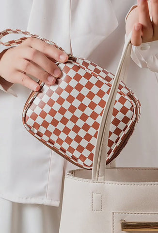 Checkered Cosmetic Makeup Travel Case, 2 Color options Pink & Camel